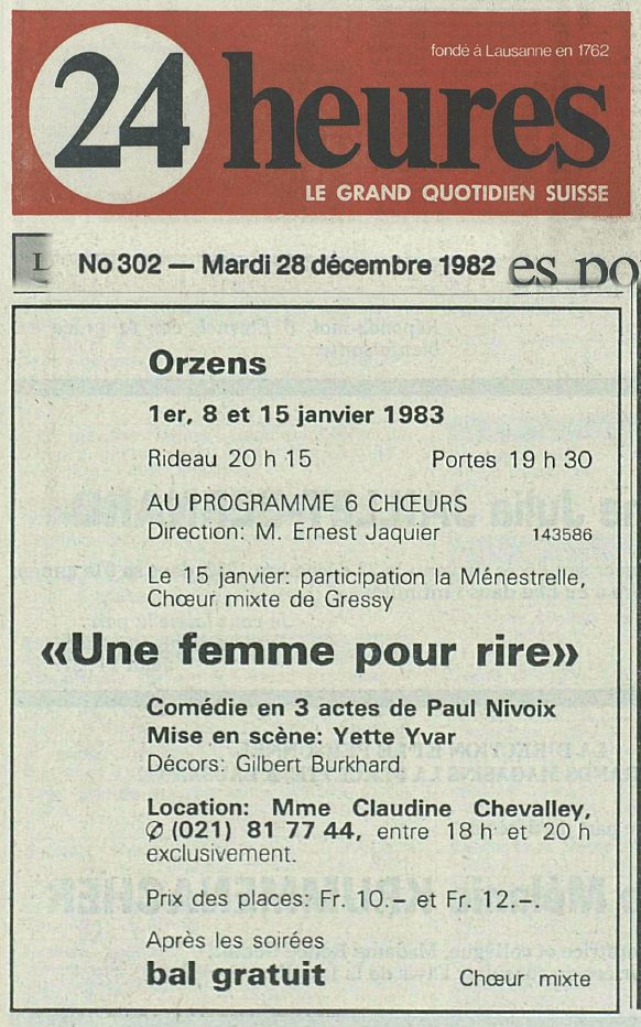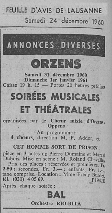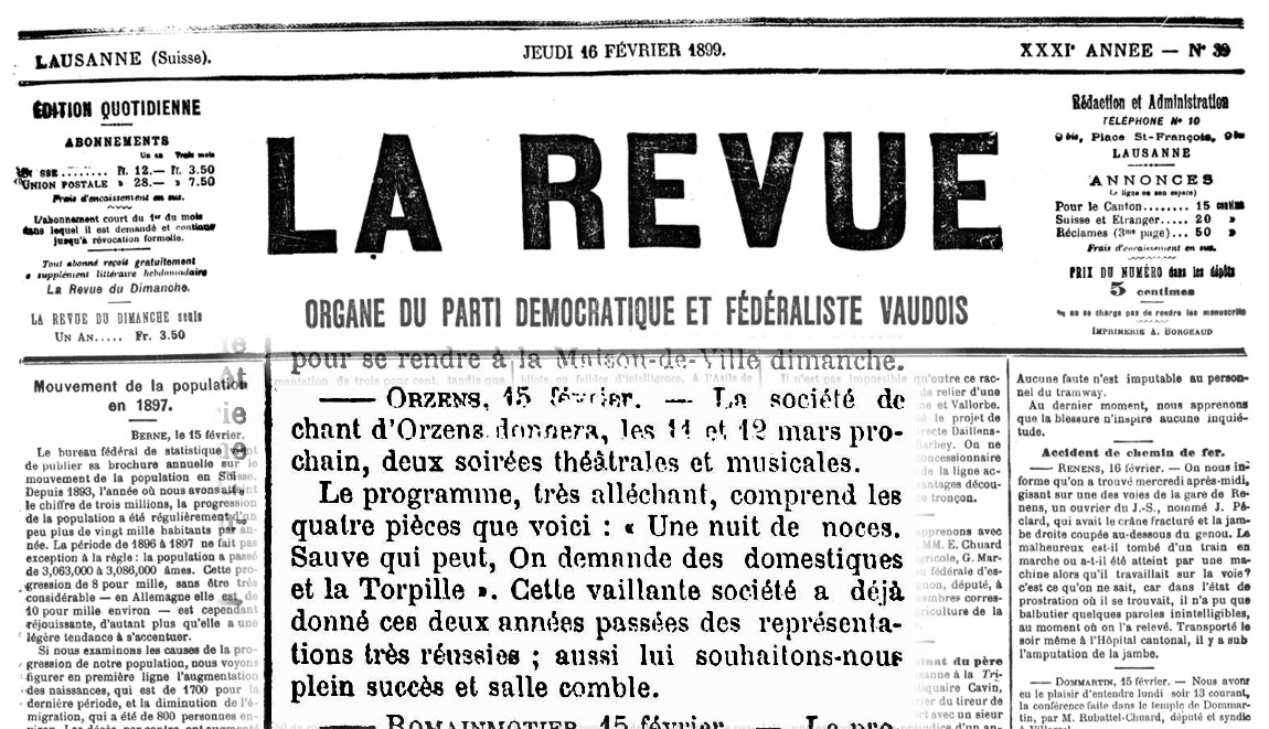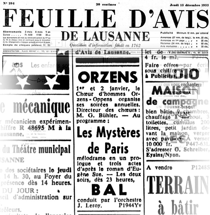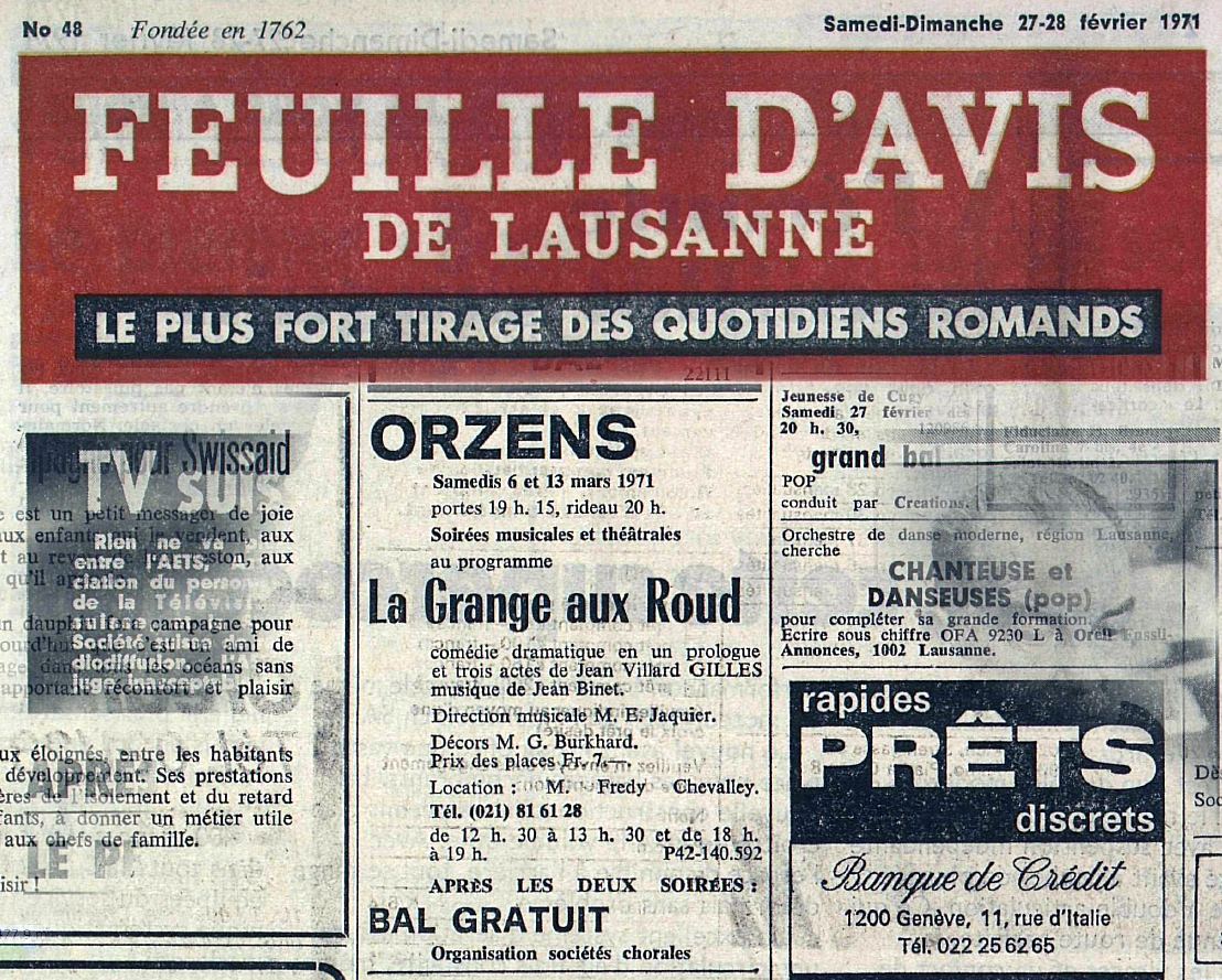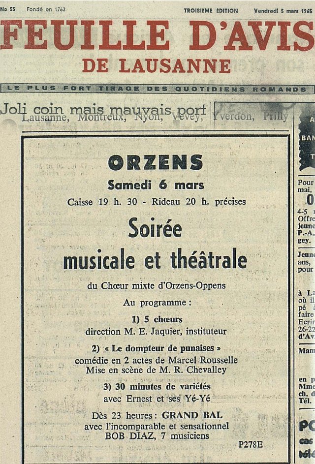 L’article ci-dessus démontre la longue tradition chorale du village d’Orzens dont les chanteurs ont participé à la première Fête cantonale des chanteurs vaudois, à Orbe, en 1853. Vous pouvez lire dans l’article du Nouvelliste Vaudois, du 7 mai 1853, qui relate la fondation de la Société cantonale des chanteurs vaudois: