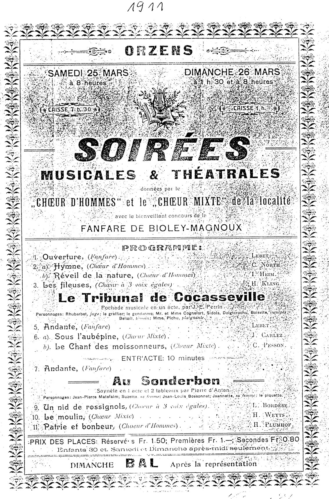 Cette société de chant est l’organisatrice de la première « Soirées théâtrales et musicales » dont nous ayons trouvez la trace, à ce jour 1897 !