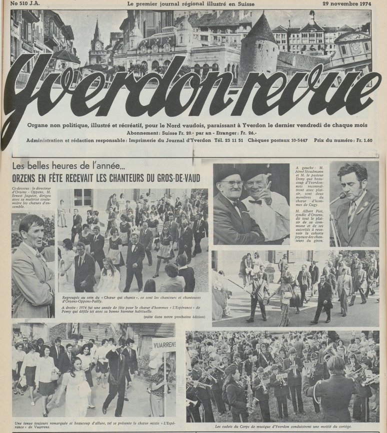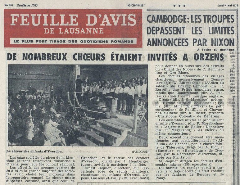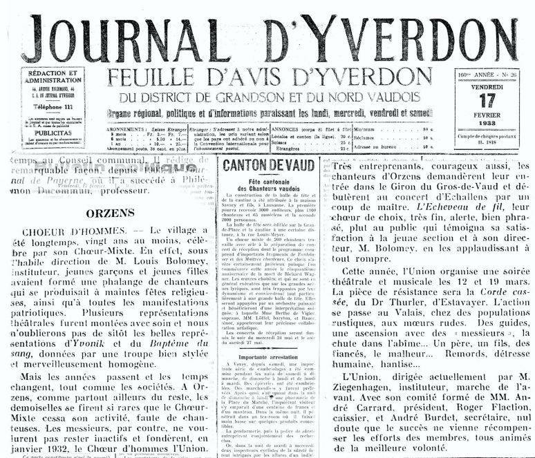 Première mention d’une chorale d’Orzens trouvée dans la presse locale (Nouvelliste Vaudois, du 7 mai 1853): elle est membre fondatrice de la Société cantonale des chanteurs vaudois…