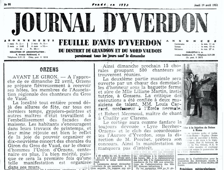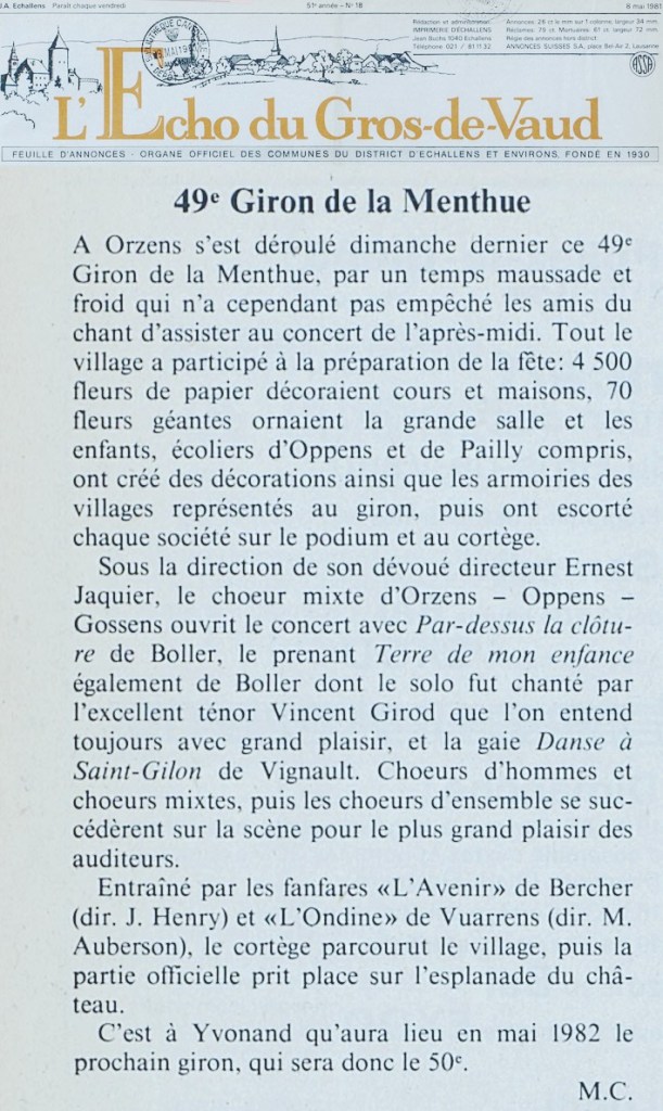 Il est intéressant de relever que les chanteurs de trois villages du Giron de la Menthue : Orzens, Thierrens et Yvonand, participèrent à la première Fête cantonale des chanteurs vaudois*, le dimanche 1er mai 1853, à Orbe. Belle tradition du chant, n’est-ce pas ? M. Cl. *[voir article en haut de page]