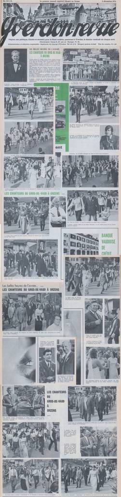 49e Giron de la Menthue à Orzens Orzens a accueilli dimanche dernier les chœurs d’hommes et chœurs mixtes du Giron de la Menthue, ainsi que le Petit Chœur des Ecoles primaires d’Yverdon, dirigé par J.-Cl. Homberger. Tout le village et ceux d’Oppens et de Pailly ont collaboré à la préparation de cette fête : 4500 fleurs de papier pour décorer cours et maisons, armoiries des communes des chanteurs que les enfants accompagnaient sur le podium et au cortège, et les chanteuses d’Orzens inauguraient même un nouveau costume brodé. Un nombreux public assistait l’après- midi au concert qui commença par les excellentes prestations d’Orzens-Oppens- Gossens, sou la direction d’Ernest Jaquier, avec le concours du ténor Vincent Girod dans l’émouvant « Terre de mon enfance » de Boller. Les fanfares de Bercher et de Vuarrens encadraient les choristes qui défilèrent dans le village, puis la partie officielle eut lieu sur l’esplanade du château. Le prochain giron, qui sera le 50e, aura lieu en mai 1982 à Yvonand.