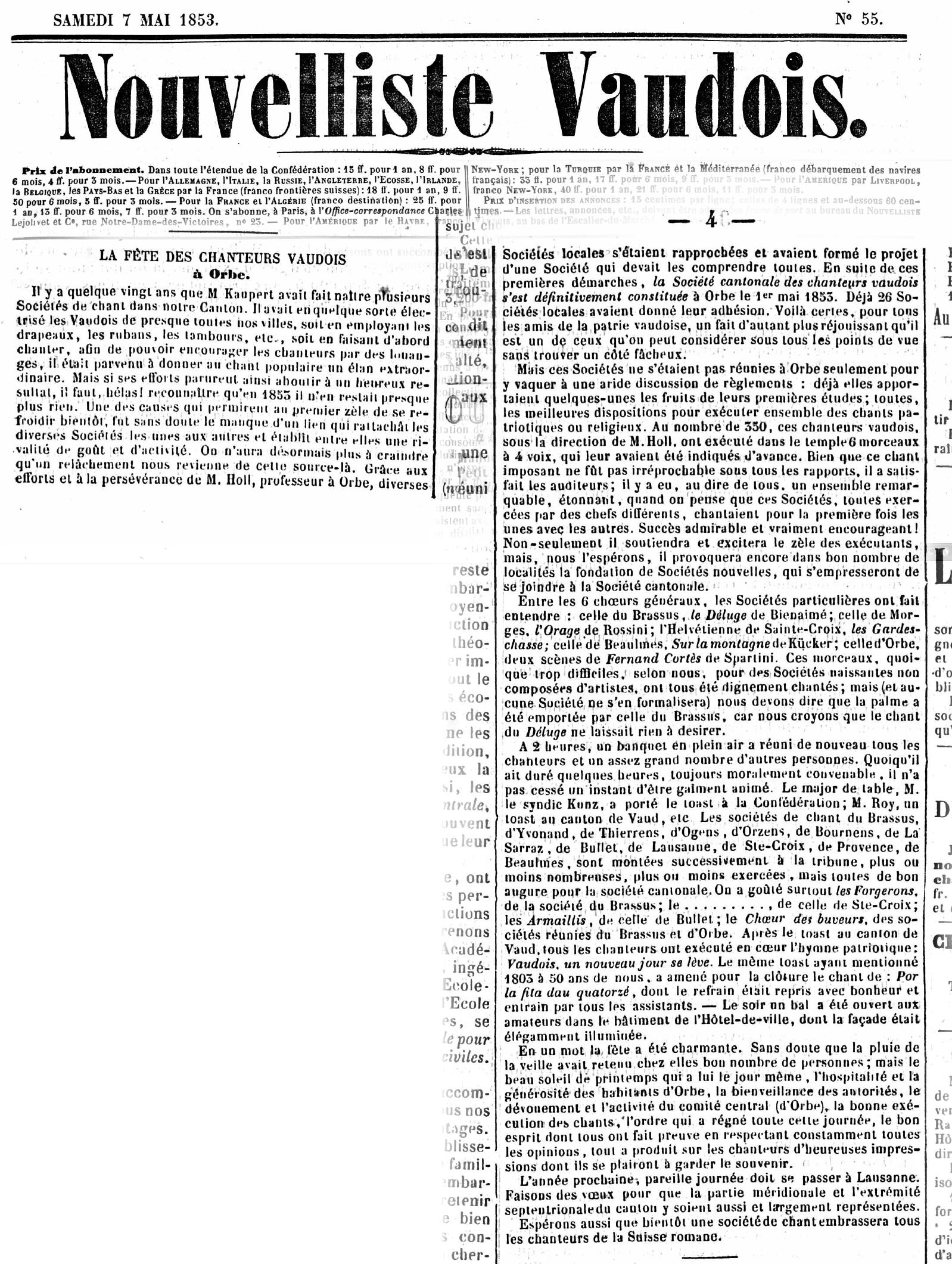Première mention d’une chorale d’Orzens trouvée dans la presse locale (Nouvelliste Vaudois, du 7 mai 1853): elle est membre fondatrice de la Société cantonale des chanteurs vaudois…