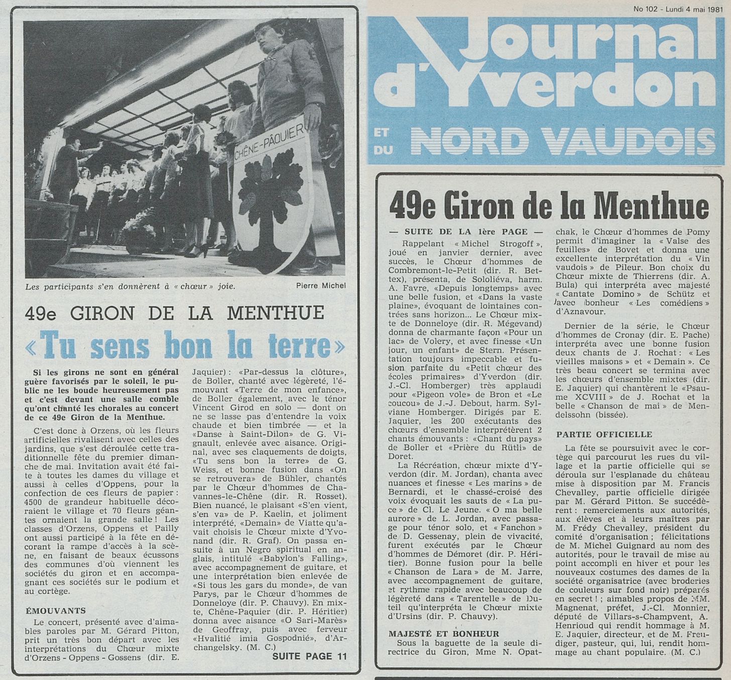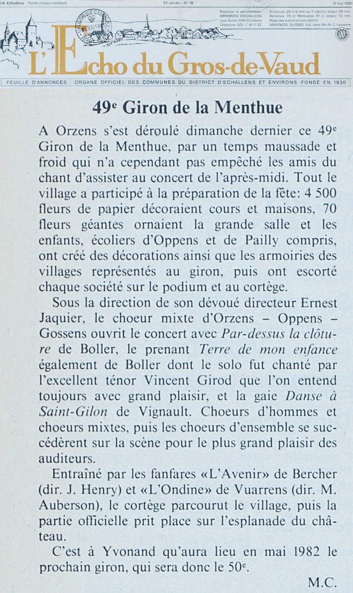 49e Giron de la Menthue à Orzens Orzens a accueilli dimanche dernier les chœurs d’hommes et chœurs mixtes du Giron de la Menthue, ainsi que le Petit Chœur des Ecoles primaires d’Yverdon, dirigé par J.-Cl. Homberger. Tout le village et ceux d’Oppens et de Pailly ont collaboré à la préparation de cette fête : 4500 fleurs de papier pour décorer cours et maisons, armoiries des communes des chanteurs que les enfants accompagnaient sur le podium et au cortège, et les chanteuses d’Orzens inauguraient même un nouveau costume brodé. Un nombreux public assistait l’après- midi au concert qui commença par les excellentes prestations d’Orzens-Oppens- Gossens, sou la direction d’Ernest Jaquier, avec le concours du ténor Vincent Girod dans l’émouvant « Terre de mon enfance » de Boller. Les fanfares de Bercher et de Vuarrens encadraient les choristes qui défilèrent dans le village, puis la partie officielle eut lieu sur l’esplanade du château. Le prochain giron, qui sera le 50e, aura lieu en mai 1982 à Yvonand.