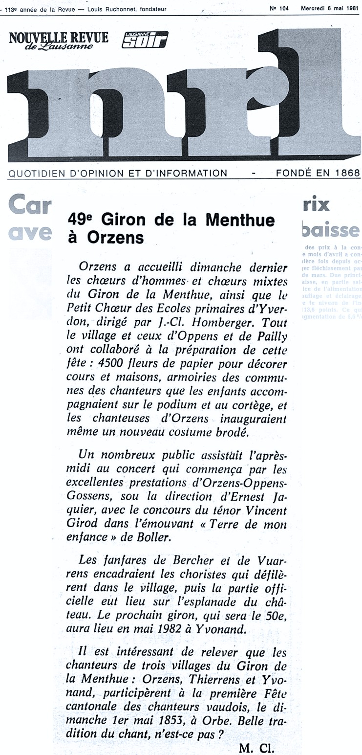 Il est intéressant de relever que les chanteurs de trois villages du Giron de la Menthue : Orzens, Thierrens et Yvonand, participèrent à la première Fête cantonale des chanteurs vaudois*, le dimanche 1er mai 1853, à Orbe. Belle tradition du chant, n’est-ce pas ? M. Cl. *[voir article en haut de page]