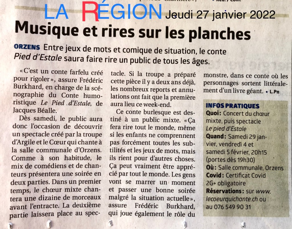28, 29 janvier, 2, 4 & 5 février 2022 spectacle du « Cœur qui Chante » et de la Troupe d’Argile.