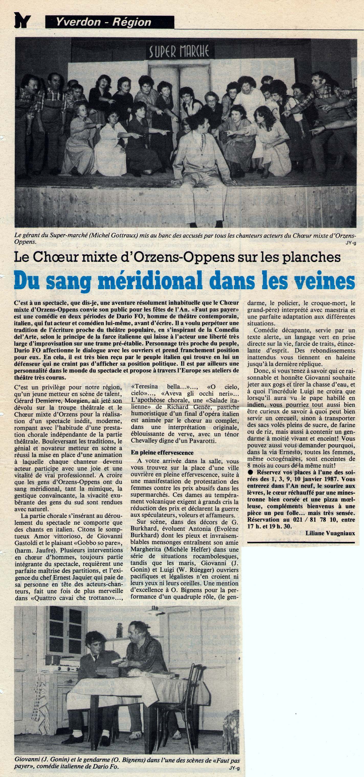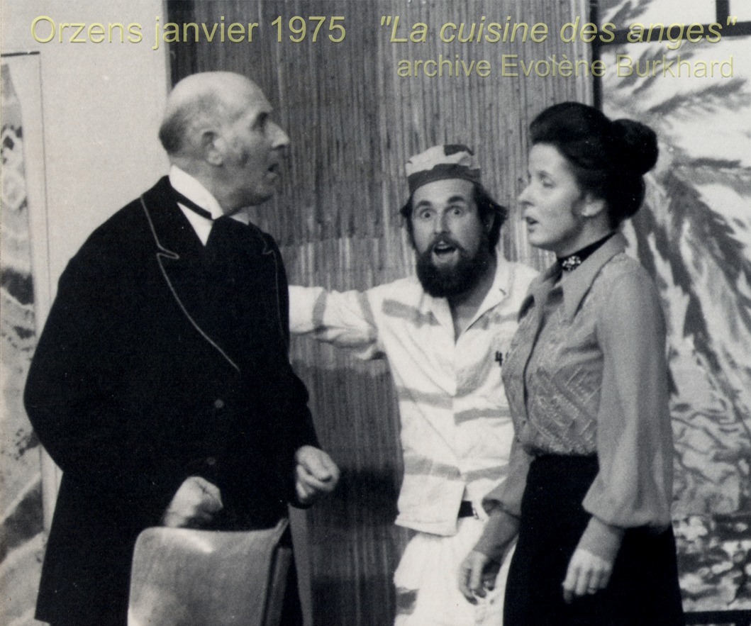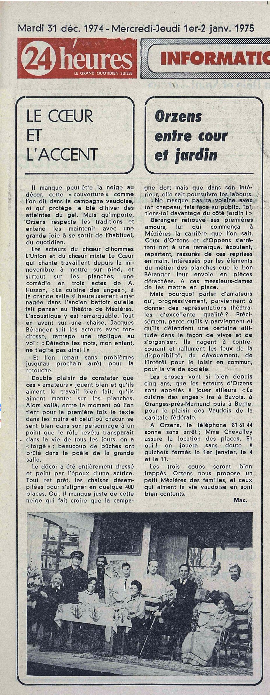 gne dort mais que dans son Intérieur, elle sait poursuivre les labours. « Ne masque pas ta voisine avec ton chapeau, fais face au public. Toi, tiens-toi davantage du côté jardin ! » Béranger retrouve ses premières amours, lui qui commença à Mézières la carrière que l’on sait. Ceux d’Orzens et d’Oppens s’arrêtent net à une remarque, écoutent, repartent, rassurés de ces reprises en main, intéressés par les éléments du métier des planches que le bon Béranger leur envoie en pièces détachées. A ces messieurs-dames de les mettre en place. Mais pourquoi parler d’amateurs qui, progressivement, parviennent à donner des représentations théâtrales d’excellente qualité ? Précisément, parce qu’ils y parviennent et qu’ils défendent une certaine attitude dans la façon de vivre et de s’organiser. Ils nagent à contre- courant et rallument les feux de la disponibilité, du dévouement, de l’intérêt pour le loisir en commun, pour la vie de société. Les choses vont si bien depuis cinq ans, que les acteurs d’Orzens sont appelés à jouer ailleurs. « La cuisine des anges » ira à Bavois, à Granges-près-Marnand puis à Berne, pour le plaisir des Vaudois de la capitale fédérale. A Orzens, le téléphone 81 61 44 sonne sans arrêt ; Mme Chevalley assure la location des places. Eh oui I on jouera sans doute à guichets fermés le 1er janvier, le 4 et le 11. Les trois coups seront bien frappés. Orzens nous propose un petit Mézières des familles, et ceux qui aiment la vie vaudoise en sont bien contents. Mac.