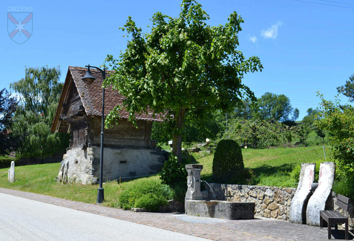 Continuons notre cheminement : la route descend vers la gauche, elle pourra vous mener soit à Gossens ou, en prenant le chemin du stand et traversant le pont sur la Menthue, vers Bioley-Magnoux. A droite deux autres choix : montez en direction de la route d’Essertines ou du chemin de Pailly. Sur cette rue, rafraichissez-vous à l’une de nos fontaines et prenez le temps d’observer la plus vieille bâtisse du village, un vieux grenier datant de 1553 ; derrière ses poutres en chêne patinées par le temps, vous verrez peut-être un sculpteur à l’ouvrage. Arrêtez-vous et je vous ferai volontiers la conversation !