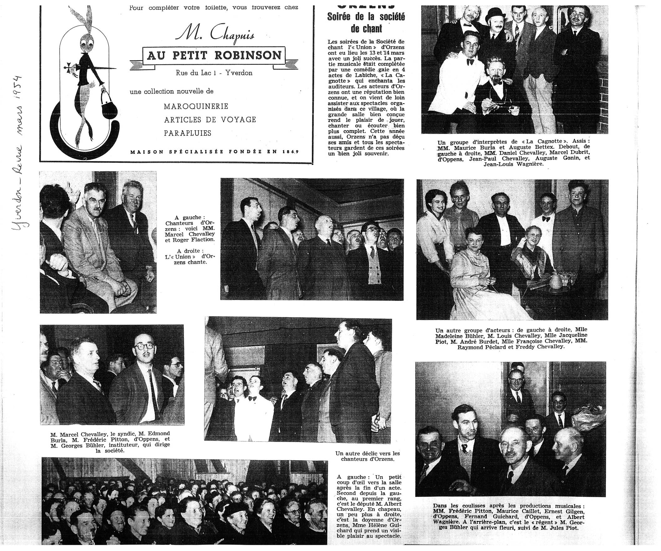 Les planches ont été réalisées sur la base d’une photo de l’Yverdon-Revue. Mars 1954. Les spectateurs de la comédie en 4 actes de Labiche « La Cagnotte ». Au centre, en chapeau, la doyenne du village Mme Hélène Guichard.