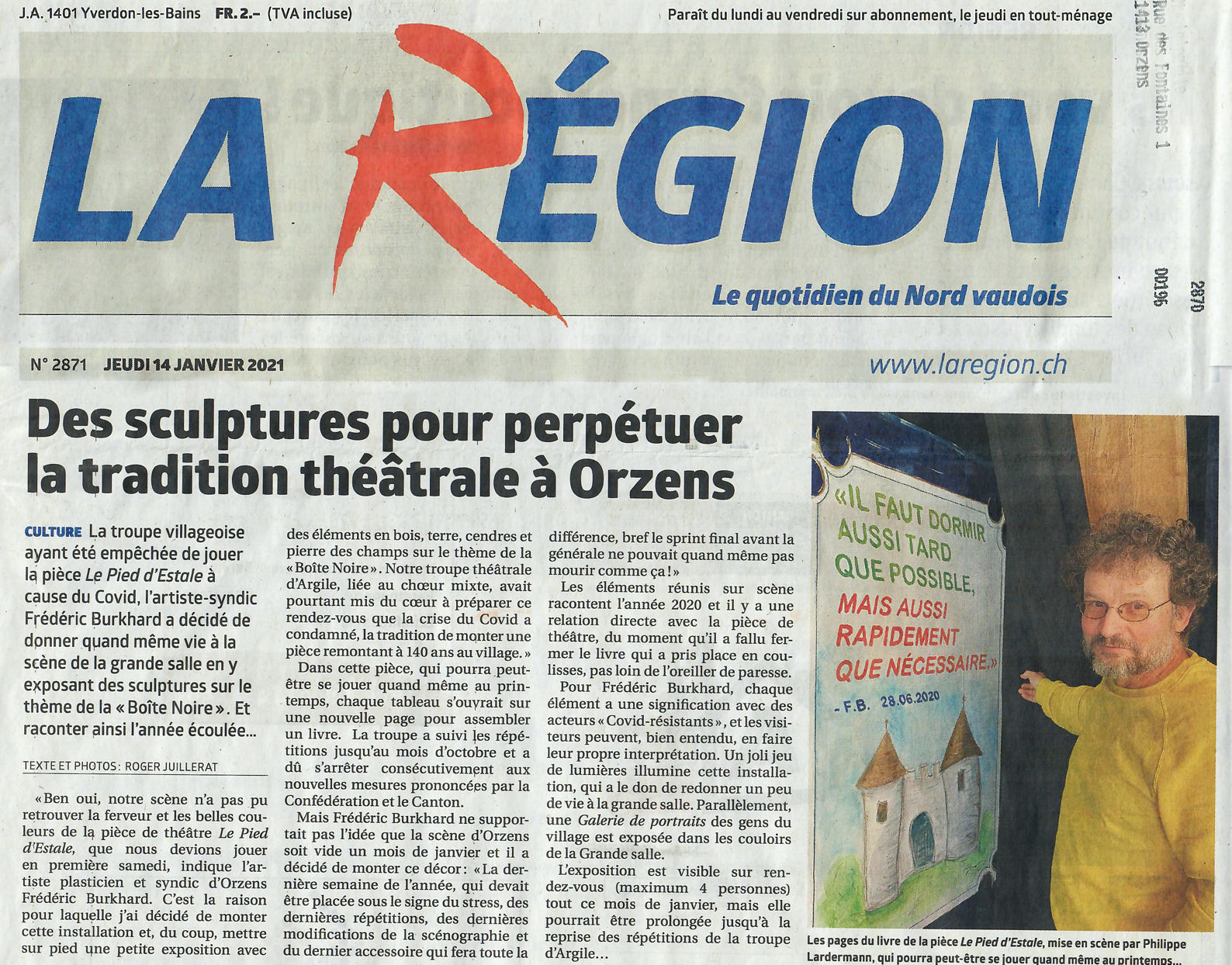La scène d’Orzens n’a pu accueillir ni acteurs, les répétitions ayant été annulées en octobre, ni spectateurs, la faute à A.B..c, ce mois de janvier 2021; donc j’y ai monté, mis en scène, une installation, « Boîte noire », avec des acteurs «Covid-résistants» – en bois, terre, cendres et pierre des champs… Frédéric Burkha scénographe.